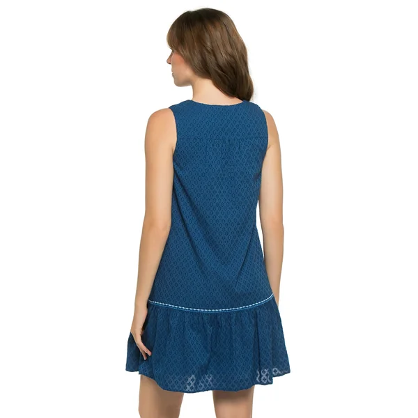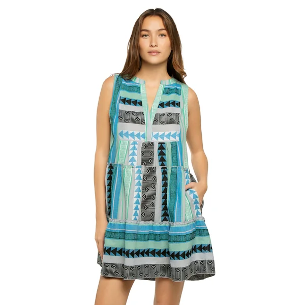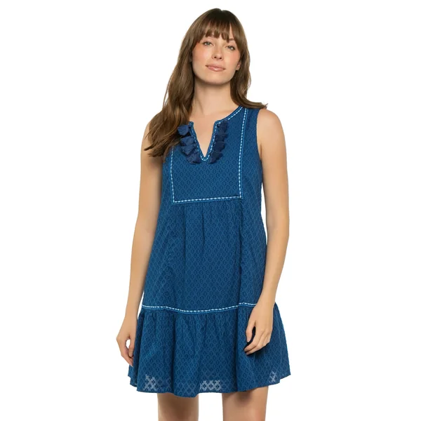 Mini dress features textured cotton clip fabric, split neckline detailed with tassels, side seam pockets and tiered ruffle hemline.