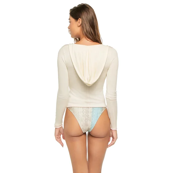 Hoodie features sheer fabric, v-neckline, and long sleeves.