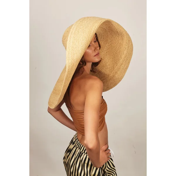 Sober spinner sun hat is made from 5/16″ raffia tape that is zigzagged edge to edge into a coil and then gracefully eases out to its final shape. Offers flexibility and can be worn while lying down on the beach. Can be rolled up like a yoga mat for easy travel.