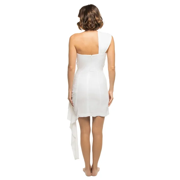Solange mini dress boasts an asymmetrical neckline with a stylish twist detail, complemented by a gathered design and elegant draped detailing. Hidden zip closer at back.