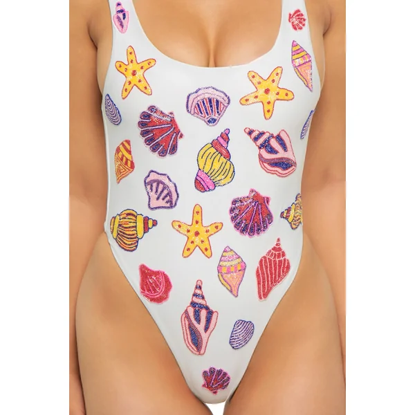 One piece swimsuit features hand-beaded sequin seashells and starfish, scoop neckline, scoop back, and offers minimal bottom coverage.