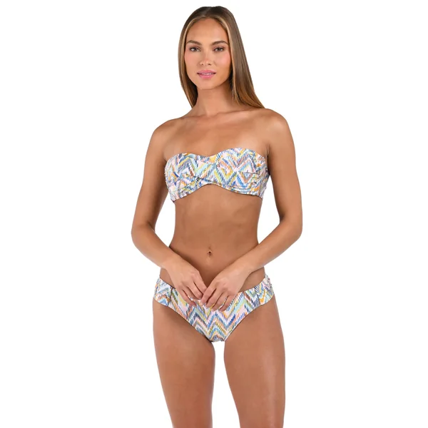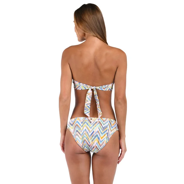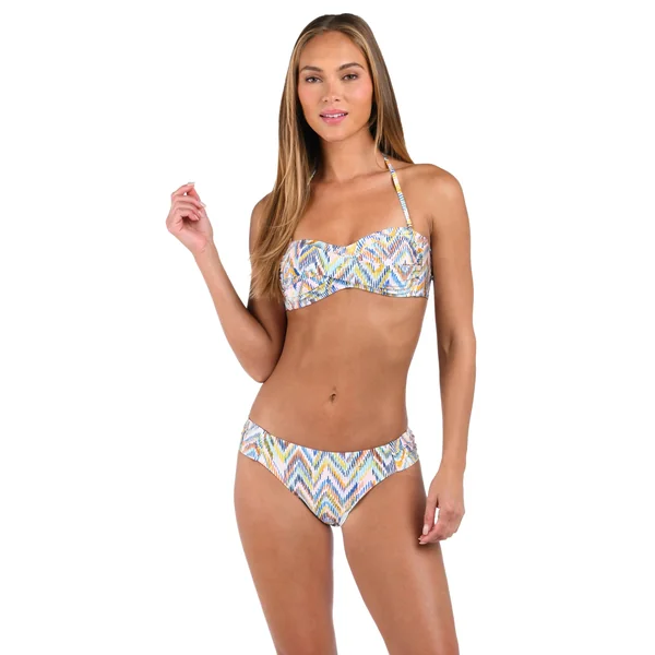 Bikini top features chevron print and a twist front with shirred detail. Offers a removable halter strap and tie back closure.