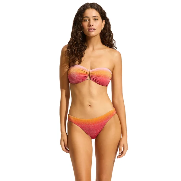 Bandeau bikini top features warm metallic ombre print and a silver u-wire detail. Offers removable soft cups, gripper tape, side boning, removable straps, and a clasp back closure.