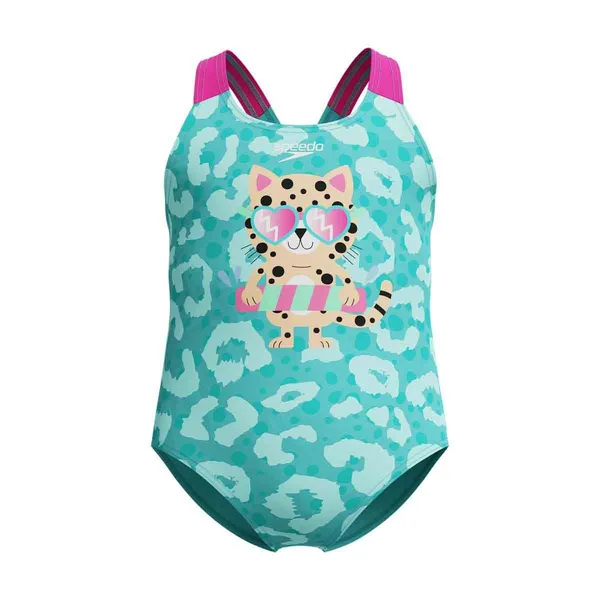 One, two, three, JUMP! Our charming swimsuit is made for splashing in the pool. Young children will enjoy the playful cheetah character and can move freely in the stretchy fabric. Comfy racerback straps stay secure whether they’re splashing in the pool or digging in the sand. Keep the fun going for longer with our EnduraBrite fabric, engineered with 4-way stretch and CREORA® HighClo™ for high chlorine resistance and superb shape retention.