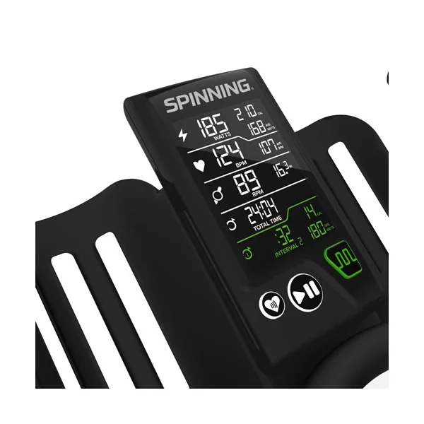 With an integrated power system, riders can monitor their power, heart rate, cadence, time, distance and calories burned on every ride. The Spinning® Integrated Power System includes a new state-of-the-art integrated console that wirelessly pairs with our SPINPower® Studio Crank that sends watts, speed, and distance data to the console.
