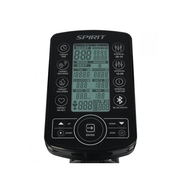 • DISPLAY: interval, target time, distance, calories, watts, speed, RPM, heart rate