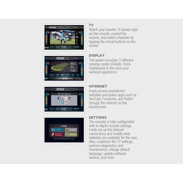TV: Watch your favorite TV shows right on the console, control the volume, and switch channels by tapping the virtual buttons on the screen The system provides 3 different viewing modes (Simple, Track, Dashboard) to ne tune your workout experience