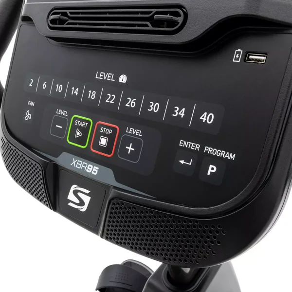 Our most popular bike, the XBR55 recumbent bike sets the standard for value and performance. Our bright 7.5” multi-color ClearView™ console keeps you engaged and informed of the metrics you care about most, including a heart rate graph to help you stay in your zone. Enjoy the convenience of an in-console USB charging port, built-in Bluetooth speakers, and an adjustable cooling fan. A variety of preset programs, including a goal-oriented Time, Calories, and Distance Series, means you can customize the training program for your next race, and convenient handlebar pulse sensors ensure you stay in your zone. With a 24 lb flywheel and 20 levels of magnetic resistance, you will stay challenged during every workout session.