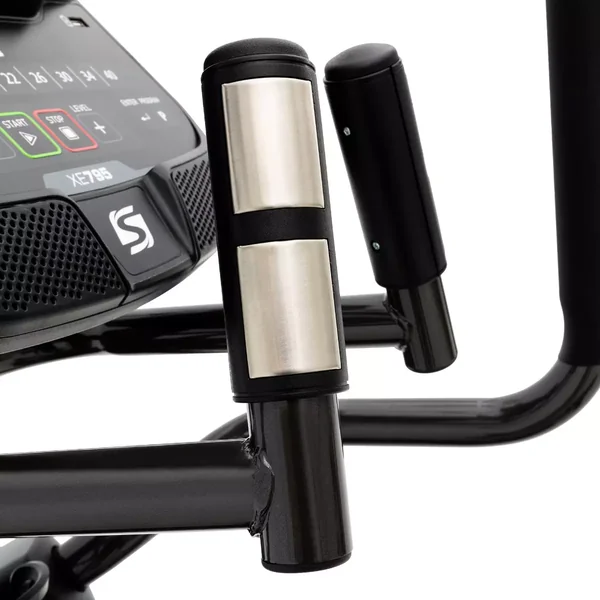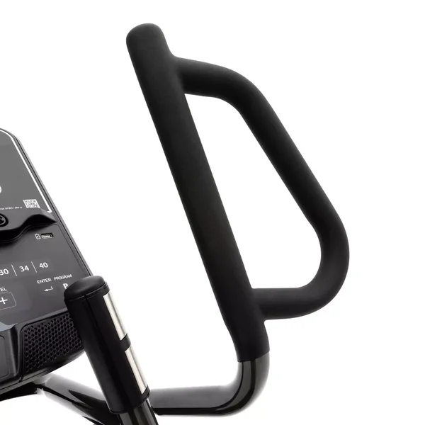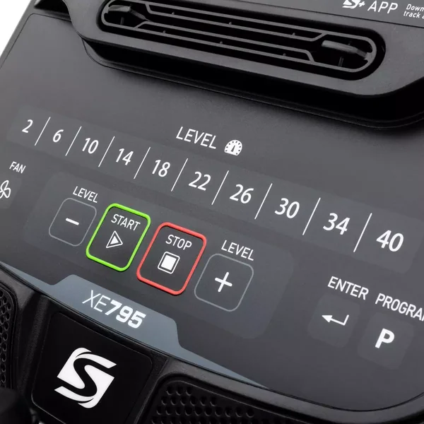 The XE795 is self-powered, meaning no cords to worry about. You can place this product anywhere. A natural 20″ stride length and narrow pedal spacing ensures an ideal stride motion, while the oversized, cushioned foot pedals and cushioned ergonomic hand grips ensure comfort at all touch points. The large sealed roller bearings used with the pedal arms and handlebars, along with the dual roller wheels and aluminum tracks, ensure a smooth and reliable workout. Plus, our new removable swivel-tilt tablet holder makes it easy to keep your phone or tablet in view for entertainment or virtual fitness classes, without obscuring console workout data.