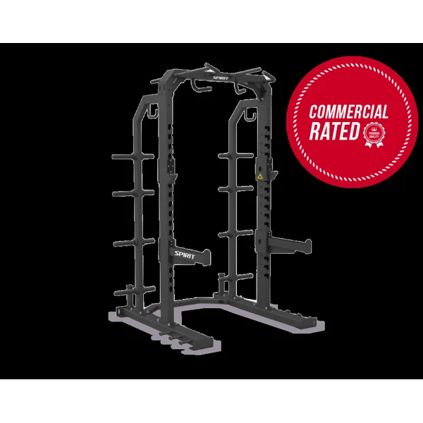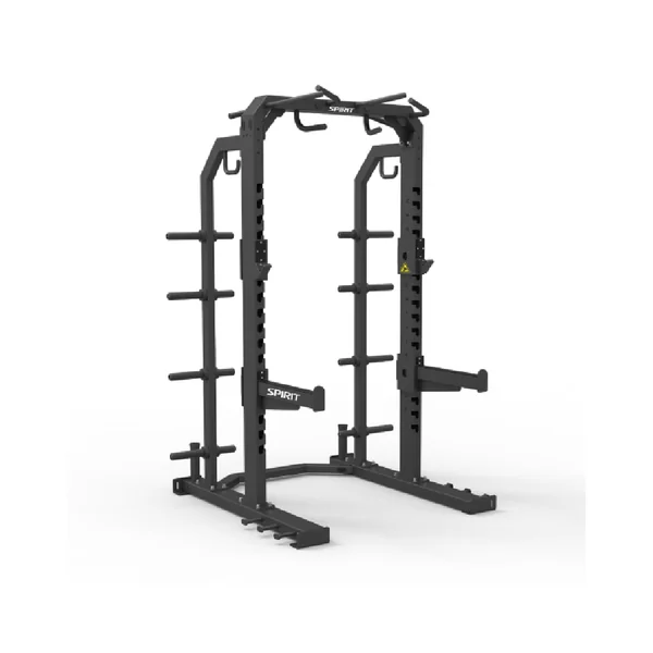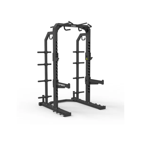 An essential addition to any club, the Half Rack provides athletes of all levels with the versatility to safely perform a wide range of lifts. J-Hook style bar holders and adjustable safety stops ensure safety and confidence. Plus, standard band pegs, multiple pull up grips, and 650 lb dual safety catch capacity allow for even more exercises keeping users challenged and engaged.