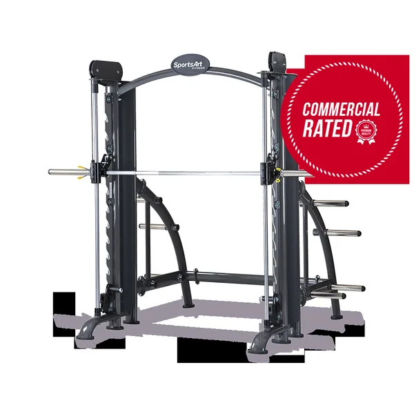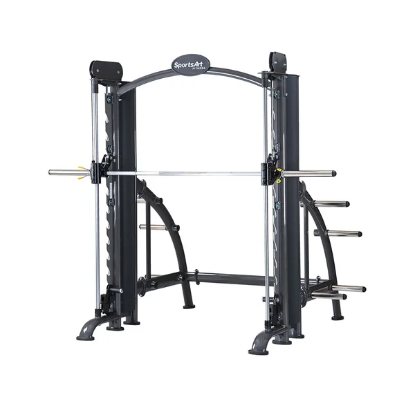 • The chrome Olympic bar travels on a linear bearing and chromed guide rod system for smooth execution of all Smith machine exercises including presses and squats.
