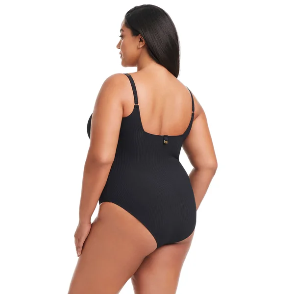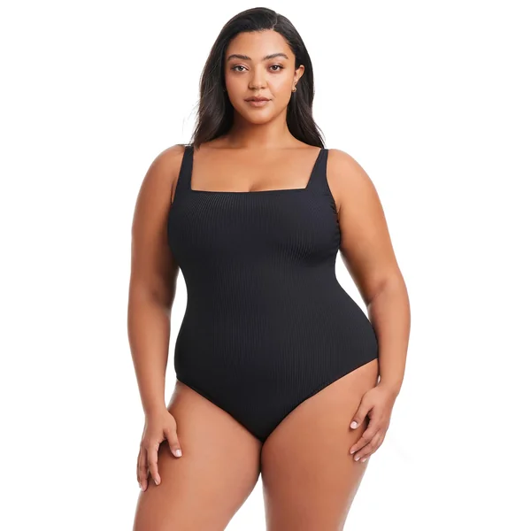 Ribbed one piece swimsuit features a square neck, floating underwire and adjustable shoulder straps.
