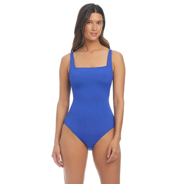 One piece swimsuit features a square neck, floating underwire and adjustable shoulder straps.