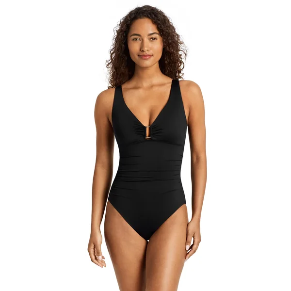 One piece swimsuit features v-neckline with a gold rectangle ring at the center and shirred detail. Offers removable cups, underwire support and tummy control.