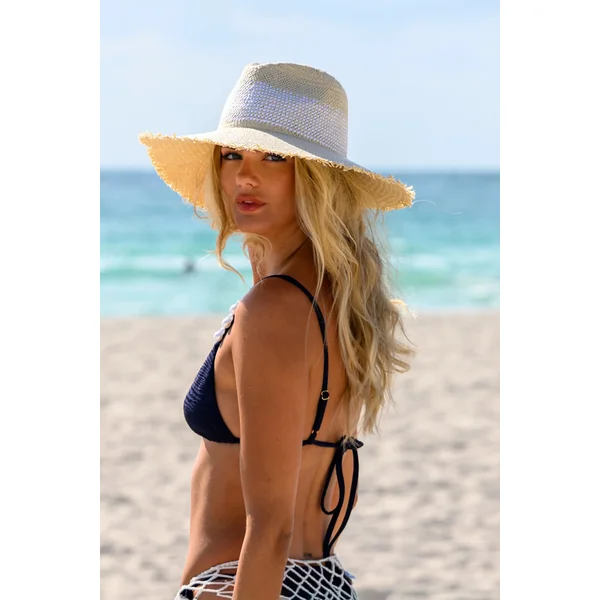 Panama hat features a wide brim and light-wash straw, crafted with mixed weaving techniques for a textured finish. Fringed edge at the brim adds a relaxed touch.