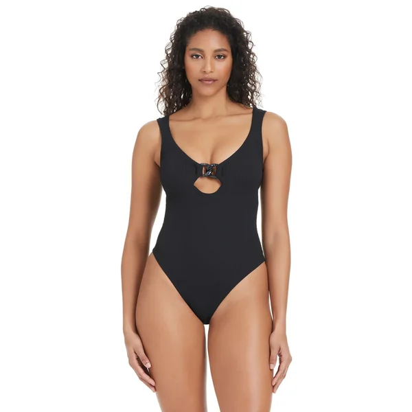 One piece swimsuit features pucker textured fabric, scoop neck with linked chain hardware and keyhole accent. Offers removable cups, high leg cut and moderate bottom coverage.