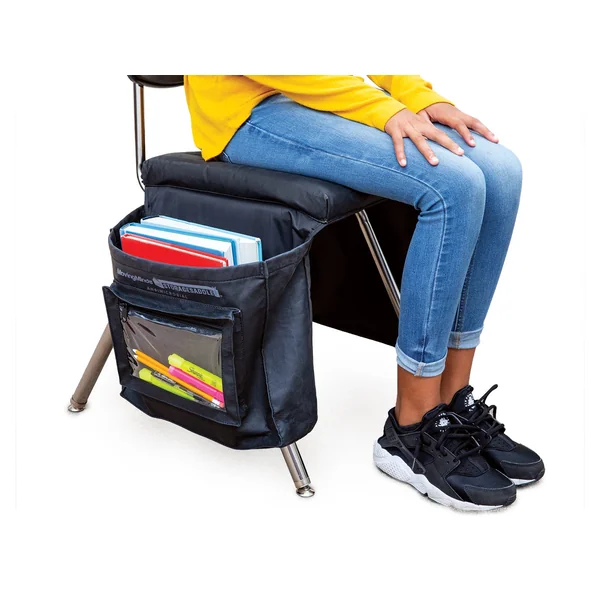 Instantly add storage and comfort to any secondary school chair with hanging pockets connected to a foam cushion. Simply drape pockets over the sides of an existing chair with the cushion on top. Folders, notebooks, and textbooks stay out of the way in each pocket to reduce clutter and distraction, but are always within reach when needed! Additional pencil pocket keeps writing utensils handy at all times. Lightweight yet durable polyurethane cover is antimicrobial and easy to fold up for compact storage when not in use. Non-slip bottom keeps cushion in place during use.