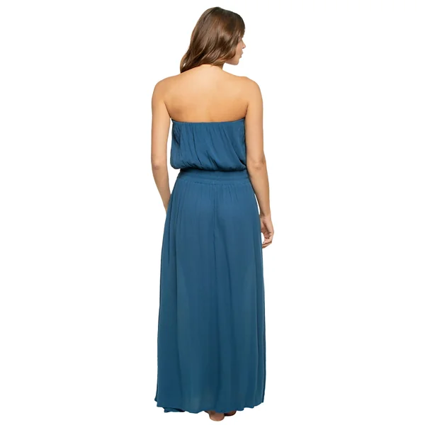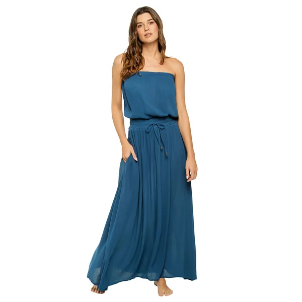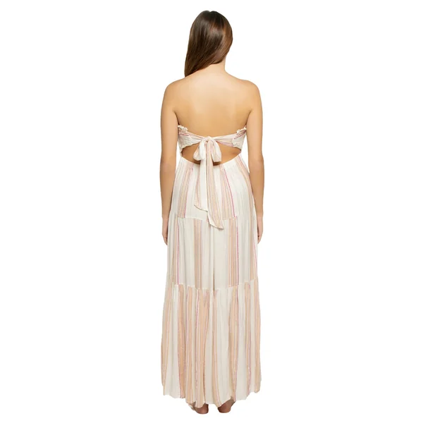Maxi dress features a smocked strapless top trimmed with ruffles, flowy tiered skirt, and tie back closure.