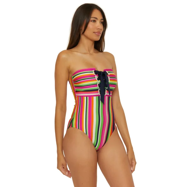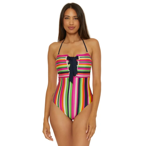 One piece swimsuit features bold striped print and a lace-up front. Offers a built in shelf bra with removable soft cups, removable halter strap, and moderate bottom coverage.