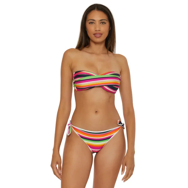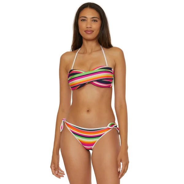One piece features bold striped print and a cross over front detail. Offers molded cups, removable halter straps, and a tie back closure.