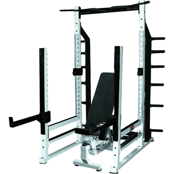 - Weight storage – Scuff-resistant weight storage pegs for 45, 35, 25, 10, 5 and 2.5 lbs plates.