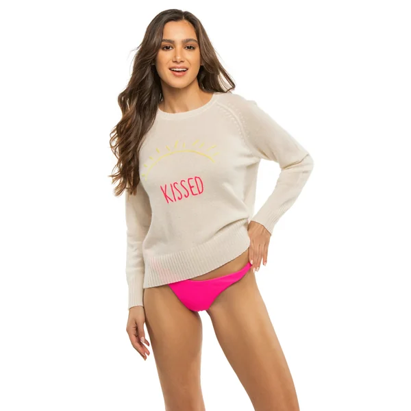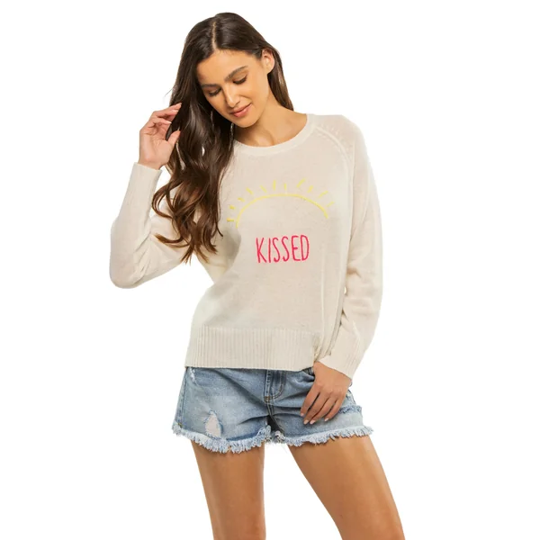 Cashmere sweater features a bold sun “KISSED” graphic with long sleeves.