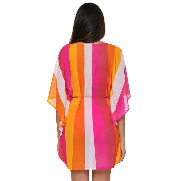 Mesh tunic offers short flutter sleeves, and an adjustable waist tie.