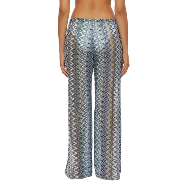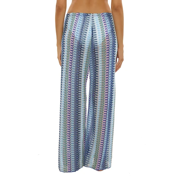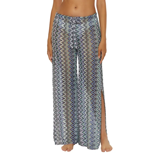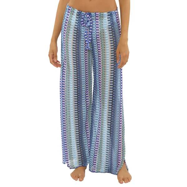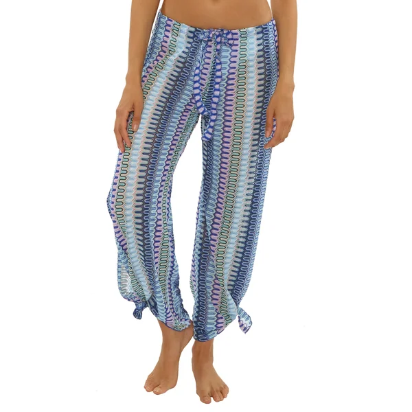 Sundown pants feature shimmer fabric and can be worn as a wide leg or harem pant with ties at hem.