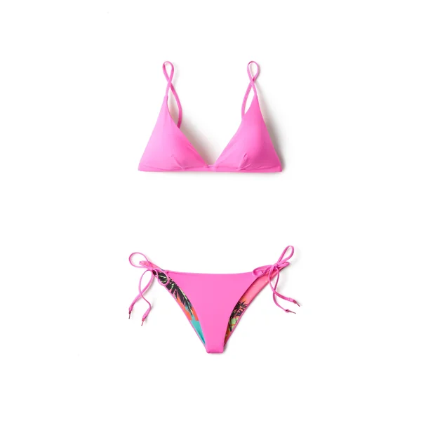 Brazilian bikini bottom reverses from solid to tropical print. Offers adjustable tie sides and minimal coverage.