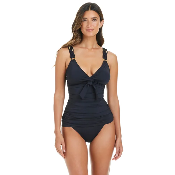 Tankini top features a surplice plunging neckline, macrame detailed straps with metal tube beads and ring accents, tie-front and shirred bodice.