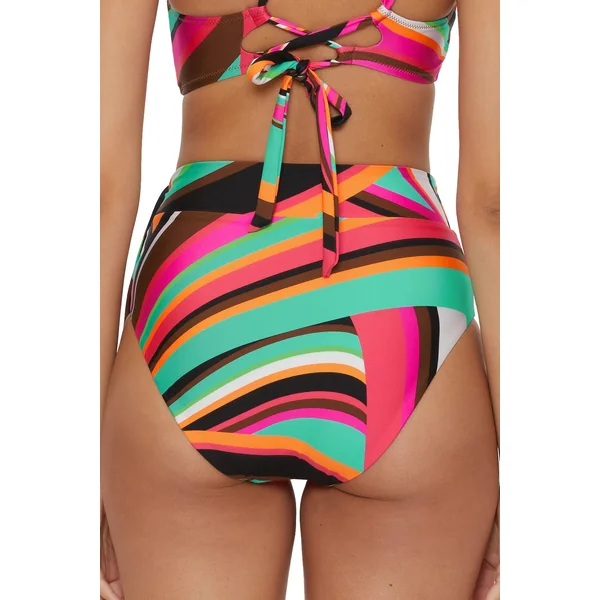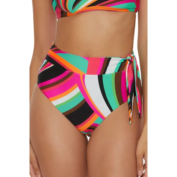 Bikini bottom features multicolor stripe pattern and high waistline with tie side sash. Offers moderate coverage.