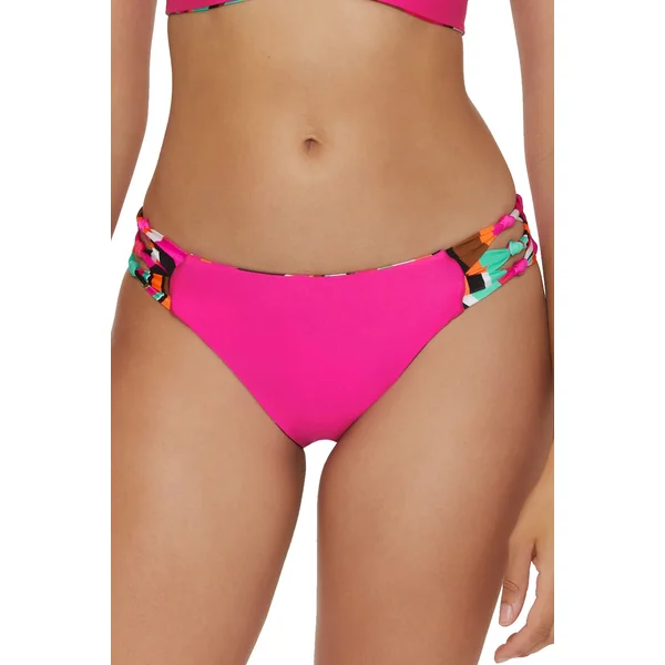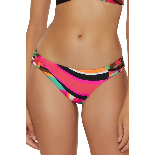 Hipster bikini bottom reverses from solid to a multicolor stripe pattern and features patterned knot details at the sides. Offers moderate coverage.