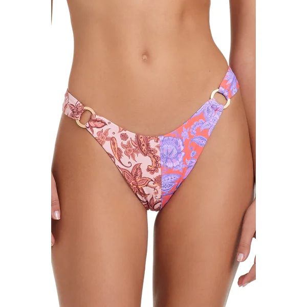 Bikini bottom features a mixed colorblock pattern, gold plated ring tab sides, and cheeky coverage.