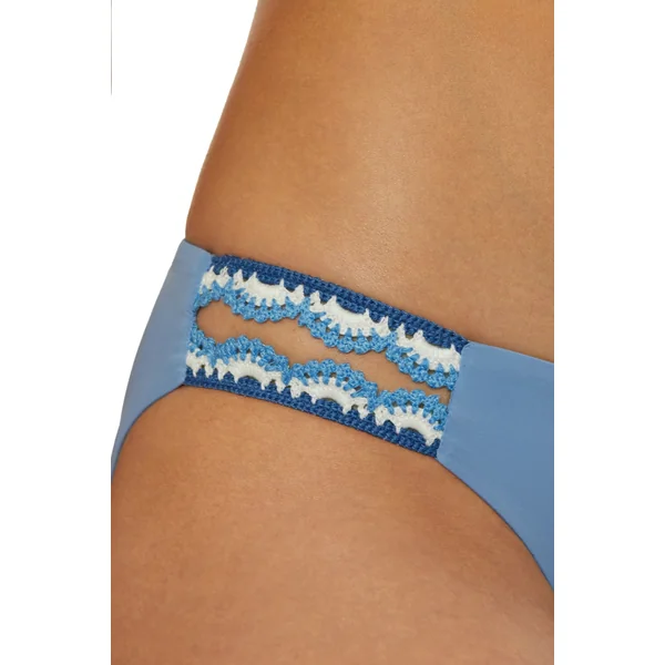 Hipster bikini bottom features scalloped crochet tab sides and offers moderate bottom coverage.