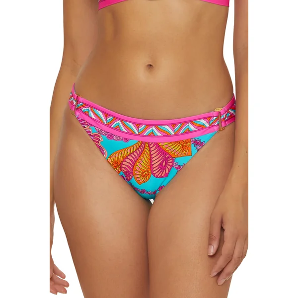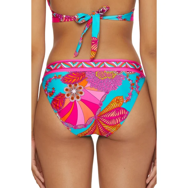 Hipster bikini bottom features a bright floral print and shirred tab sides.