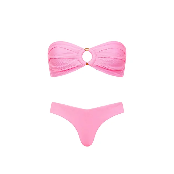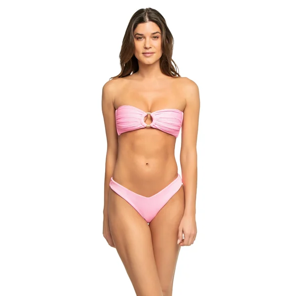 Taffy ribbed bikini top features pleat detailing, and a center ring detail. Offers side boning and an adjustable tie back closure.