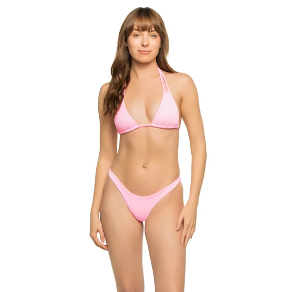 Taffy ribbed triangle top features supportive double straps, and adjustable cups with durable zig zag stitching on the hem. Offers adjustable neck and back ties.