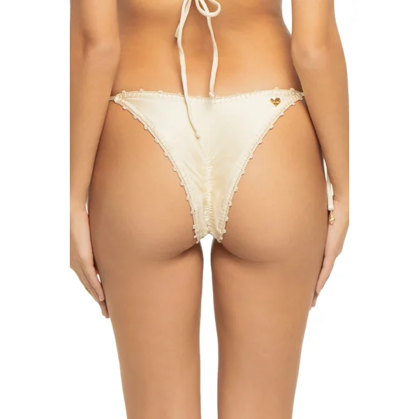 Tally brazilian bikini bottom features crochet overlaying lycra shine fabric. Offers adjustable ties, cinched back, and minimal coverage.