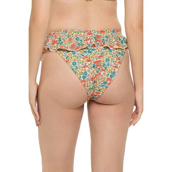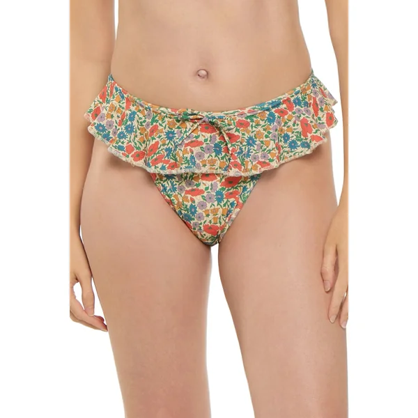 Tamarindo high waist bikini bottom features floral print, wide banded waist with ruffle detail, high leg, and skimpy bottom coverage