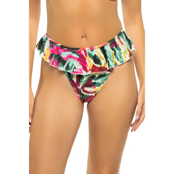 Tamarindo floral high waist bikini bottom with ruffled wide banded waist, high leg, and skimpy bottom coverage.