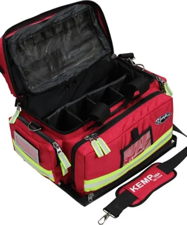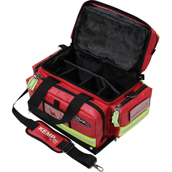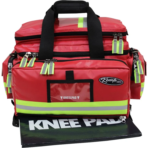 Kemp’s premium tarpaulin fluid-resistant large professional EMS trauma bag is made of heavy duty water-resistant tarpaulin material to help keep the bag clean from bodily fluids. Stress points are reinforced and the bag features high visibility reflective zip pulls and trim, and all metal black nickel hardware. The premium tarpaulin fluid-resistant EMS trauma bag offers optimum organization and easy access to the emergency supplies used by emergency professionals including a front pocket organized with elastic loops and pouches and an external easy-access top pocket. Comes with pull out kneeling pad for the rescuer to use while working on a patient, tuck-away padded backpack harness, and a gel foam padded shoulder strap. Dimensions: 17.5″ x 13″ x 10″