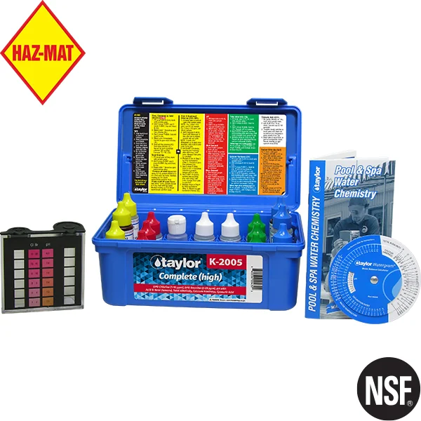 Taylor Complete 2005 Water Test Kit K-2005 is a complete (high range) swimming pool test kit with .75 oz. liquid reagents. The Taylor Complete 2005 Water Test Kit K-2005 includes printed color comparator, waterproof instructions and treatment charts, chemistry guide and Watergram.