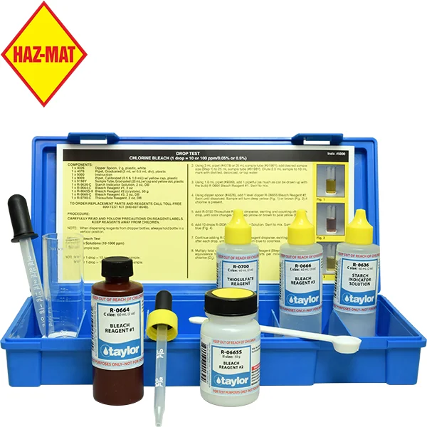 When you buy bleach solutions in bulk, you will want to test it with Taylor Technologies chlorine bleach test kit K-1579 drop test (1 drop=10 or 100 ppm) to be sure you’re getting the full strength you have purchased.