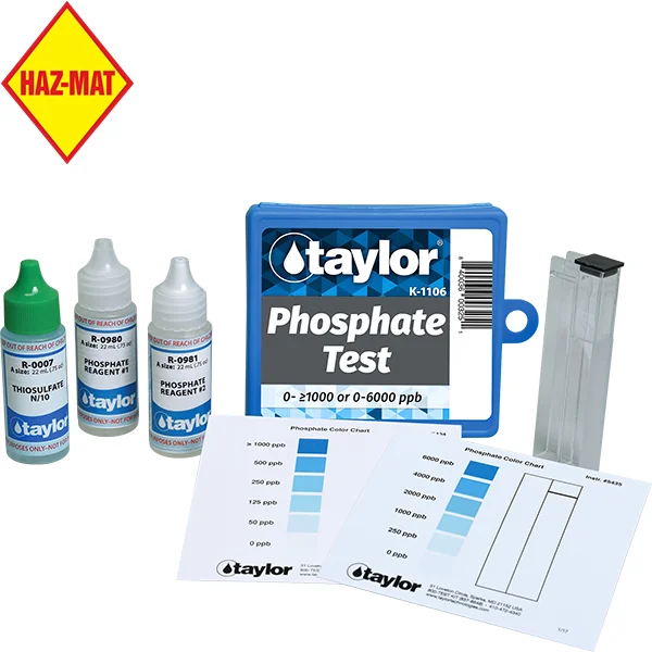 Phosphate is a primary food source for algae, so it is extremely important to monitor this parameter in your swimming pool water. The Taylor phosphate test Kit K-1106 color comparison test can detect phosphate from 0 – 6,000 ppb.