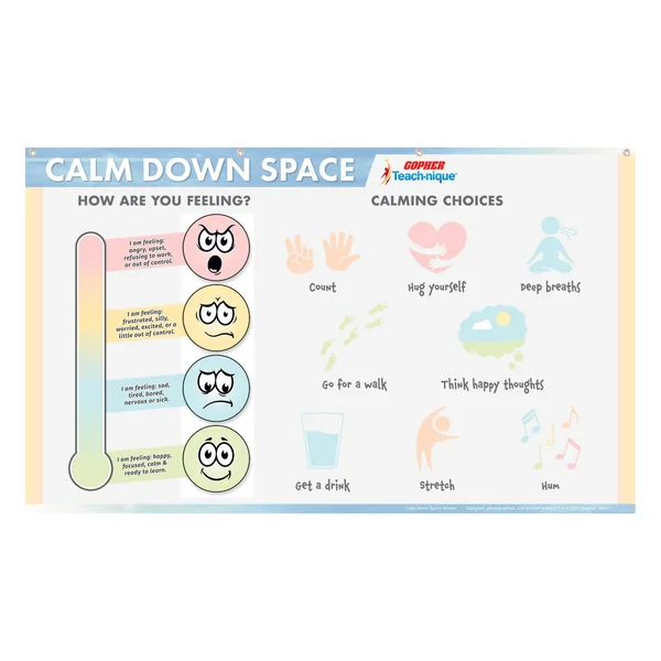 A list of 8 calming choices encourages students to count, take deep breaths, stretch, or perform other tasks when they become stressed or frustrated. Four emoji faces also help them determine how they feel in that moment. Muted colors on the large emotions poster are intended to be less overwhelming for students, while still being eye-catching when they need something to help them calm down. Opaque, smooth vinyl banners resist fraying or tearing and includes 4 grommets for easy hanging. 3′ x 5′; 2 lb.