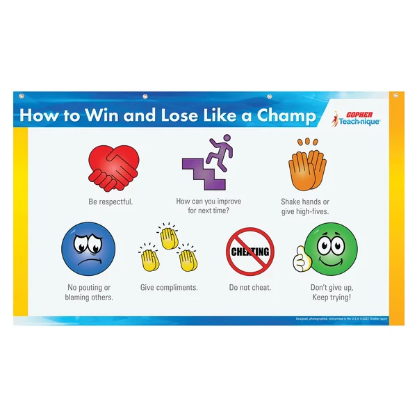 Banner illustrates various ways to win and lose gracefully using colorful graphics and straightforward prompts. It reminds students and athletes to be respectful, share compliments, and give high-fives. They are also encouraged not to pout or cheat, not to give up, and try to find a way to improve. Integrated grommets make it easy to hang and relocate the vinyl physical education posters as needed. 5’W x 3’H.