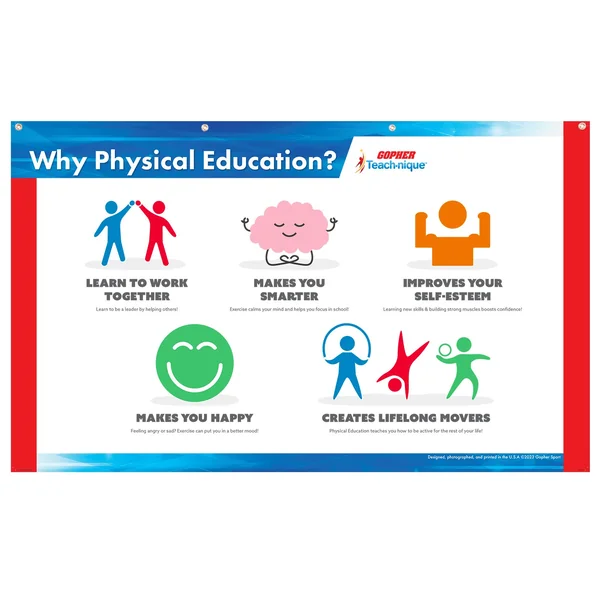 The banner features 5 examples which clearly illustrate why physical education is important. The large, colorful yet simple graphics and text are easy for all ages to understand from across the room. The banner’s 13 oz opaque, smooth vinyl construction offers long-lasting use. Easily display the banner using the included metal grommets. 5’L x 3’W; 3 lb.