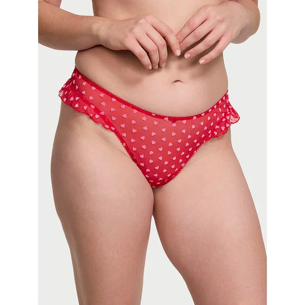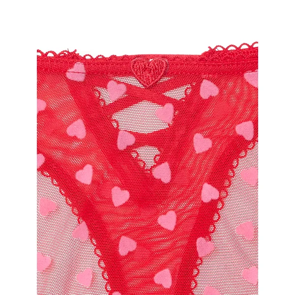 Velvety hearts and a lace-up detail in back upgrade this little pair, complete with a flattering high-cut leg and dainty ruffles.
