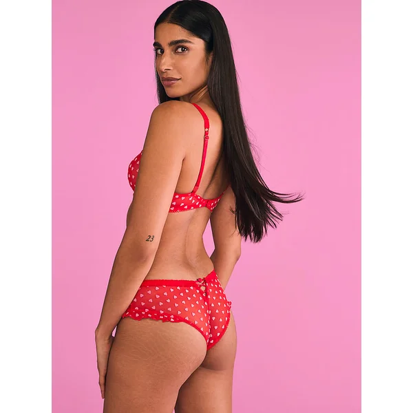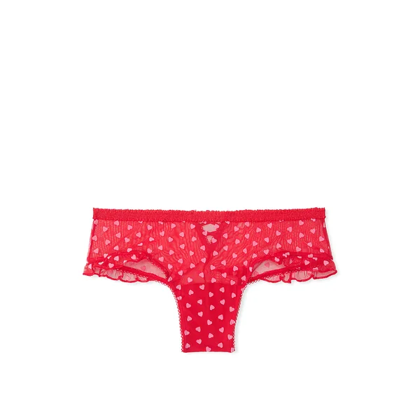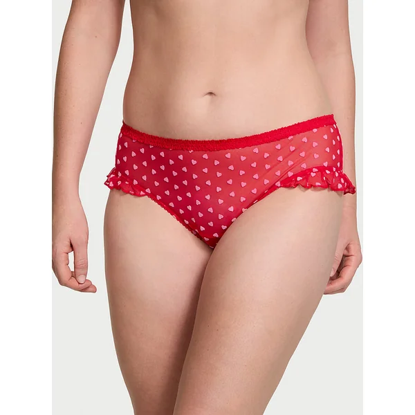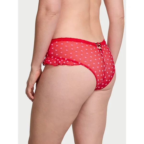Velvety hearts and a lace-up detail in back upgrade this pair, complete with ruffle accents at the legs.