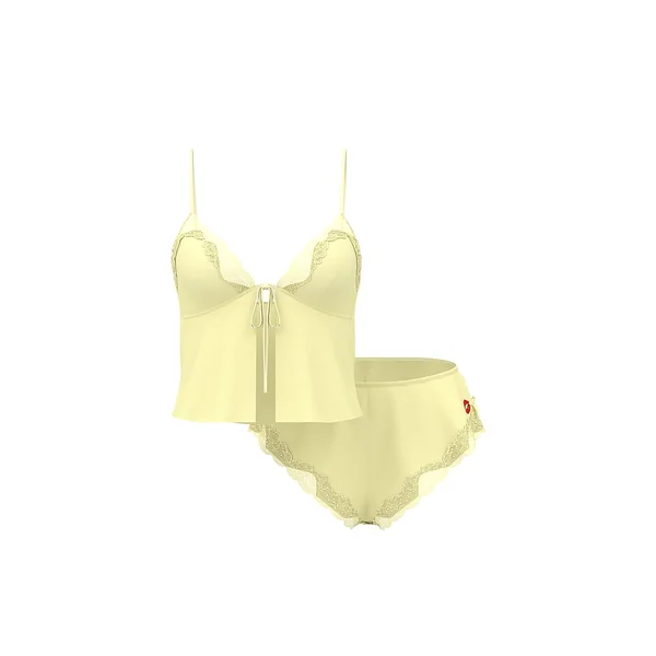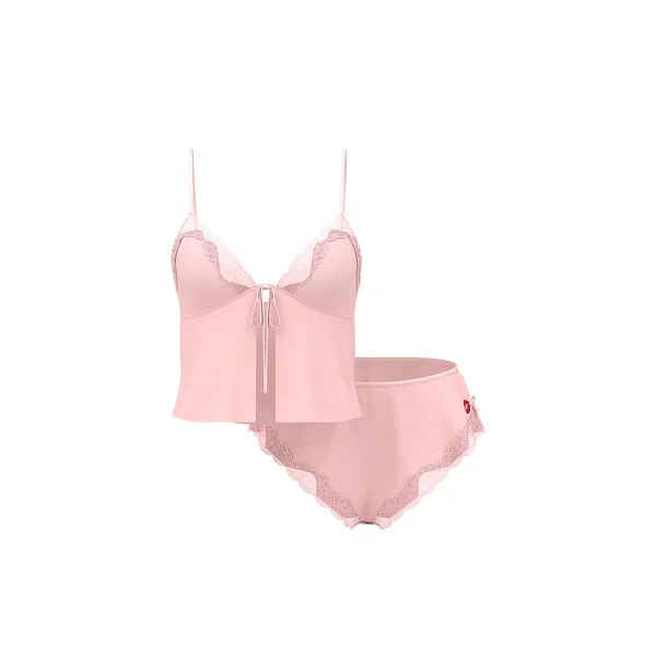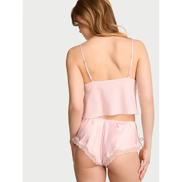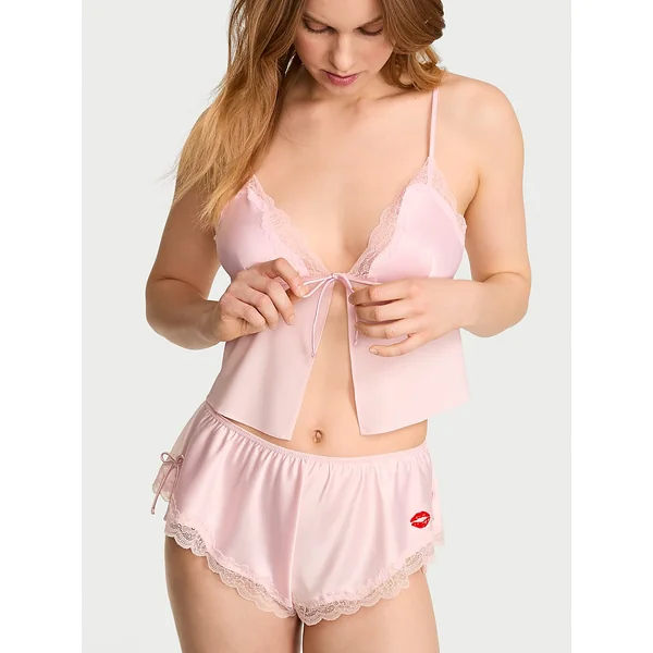 Satin, chiffon, and lace—all sealed with a kiss. A breezy, flyaway Camisole features glossy triangle cups over semi-sheer chiffon that floats with your every move. Paired with lustrous, lace-trimmed flutter shorts—with a playful pout embroidered on the side—the look is effortlessly sexy.